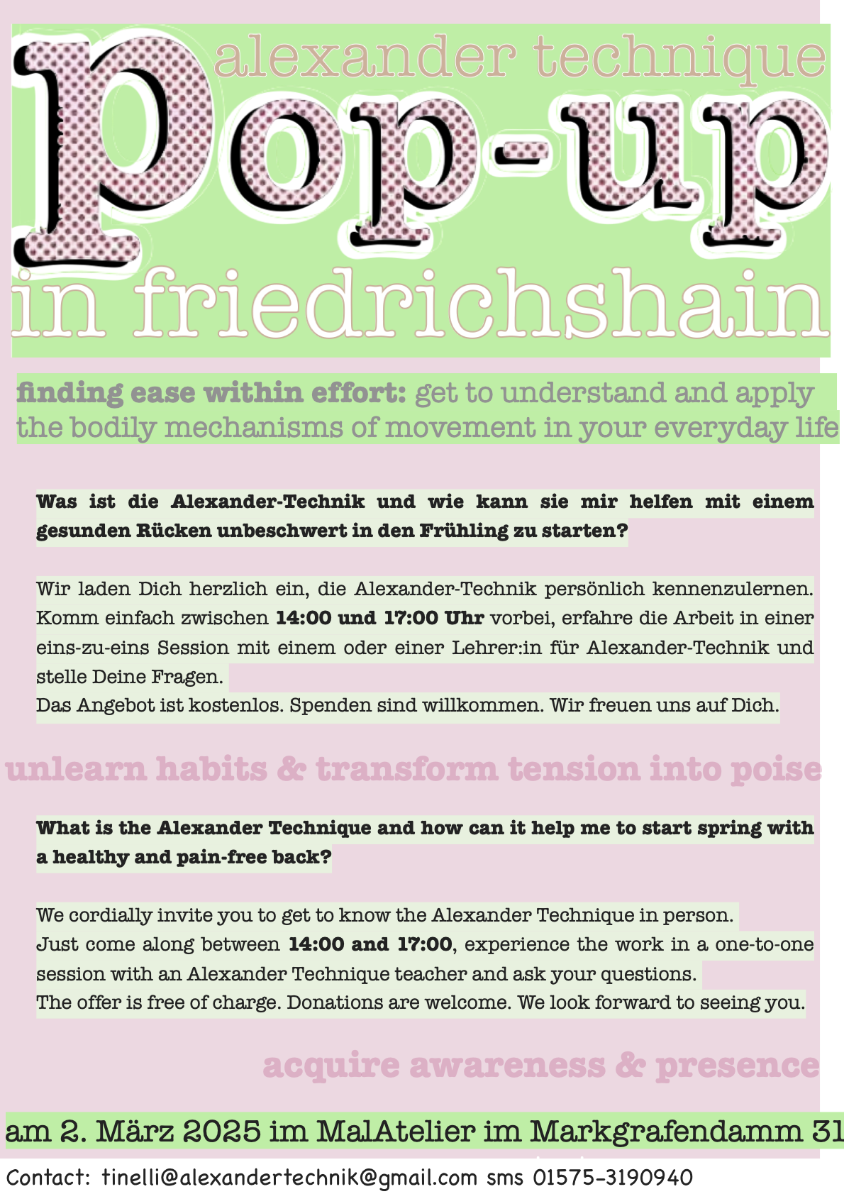 With the Alexander Technique it may become easier to take a new choice and a step into -another place to be- a new awareness. It offers a possibility of clarification, of ease and flow and deep rest. That new choice might be linked directly with getting rid of pain, but it might not at first. The new choice is foremost creating a gap or an opening from feeling or being stuck, blocked or on hold. Playfully being available to questioning the present moment finally it can become like a fresh start leading to a better outcome. The Alexander Technique opens up choices that weren’t there before, the -one way road becomes the crossing where I can choose where to go. It is in everyone’s own hands to take new steps, steps out of the comfort zone, and it might be useful to do this with a coach that gives helpful instructions [...] Read more here